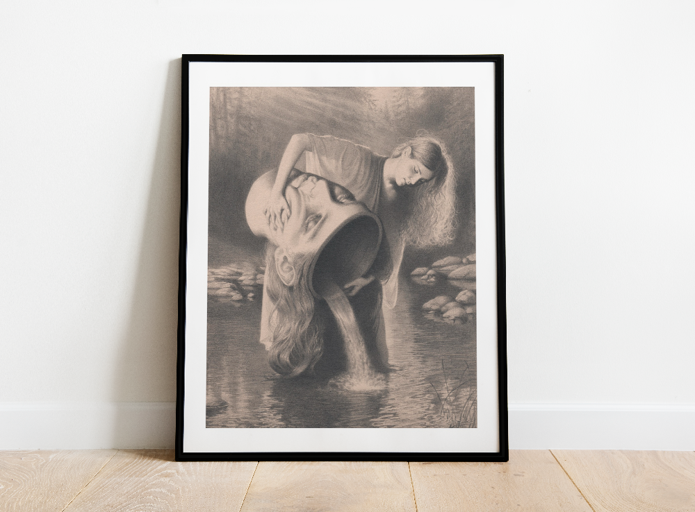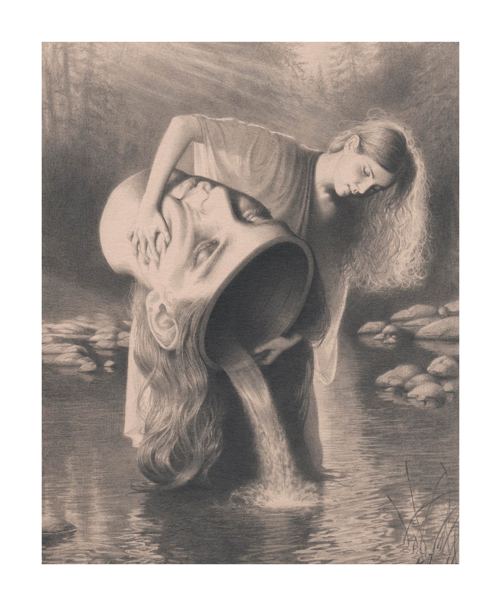 "Like all of my drawings this one emerged from an intuitive sketching process. Giant disembodied heads stand as metaphors for the ego in my work, down at a cool mountain stream our subject washes hers clean in the icy waters. If only it were so simple." - Miles